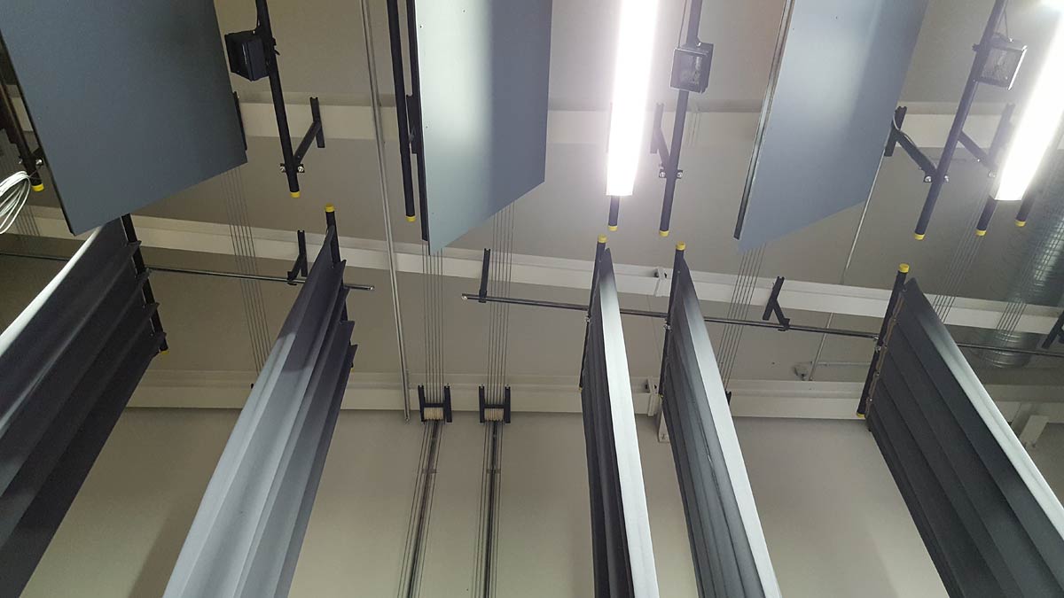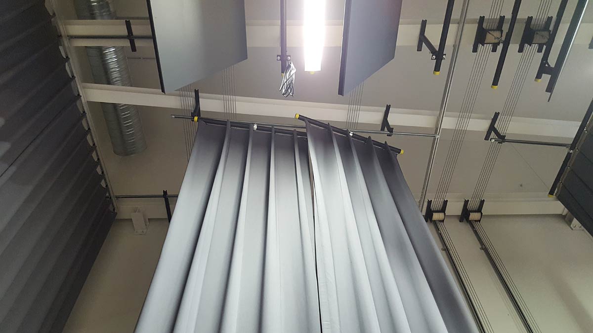 Traversen tragen Geräte und Vorhänge, Züge bewegen sie in definierte Positionen. Je nach Bedarf manuell oder motorisch, immer mit klaren Bedienpunkten und Kennzeichnungen.